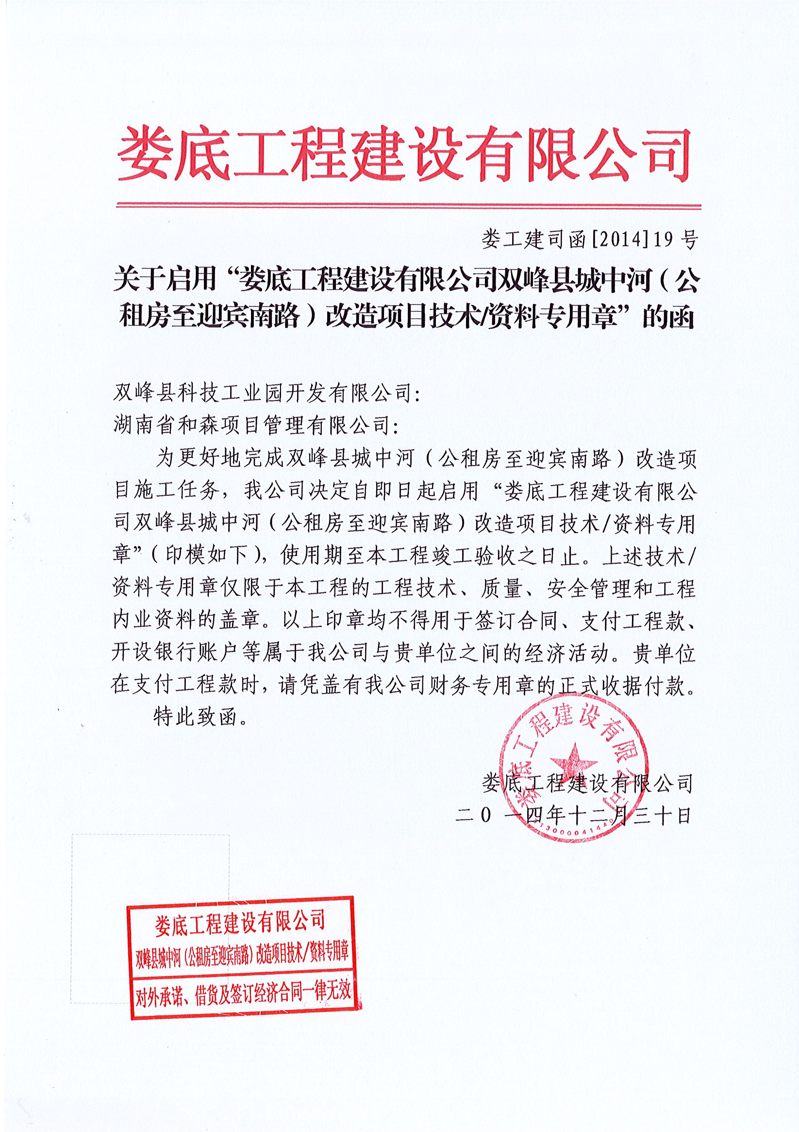 關于啟用雙峰縣城中河(公租房至迎賓南路)改造項目技術資料專用章的通告