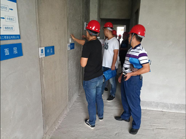 觀摩代表們來到施工現場,認真觀看了企業及項目簡介視頻、機噴砂漿工藝視頻、常見質量問題治理的模型示范樣板區、工程實體質量樣板區等。輕質混凝土砌塊砌筑、構造柱及窗臺壓頂留置、門窗洞口弱框架、內外墻機噴抹灰、外墻內保溫、屋面防水、水電安裝等工程的每道環節、工藝標準都用標牌標注得清清楚楚。并了解到我司在施工前期的創優策劃,施工過程中堅持“事前交底、事中控制、事后驗收”等一些好的管理方法。觀摩代表們紛紛表示,此次觀摩為進一步深化工程常見質量問題防治、推進質量標準化、工程創優積累了寶貴經驗。我司主要負責人、技術人員、講解員與觀摩代表們分享了在工程質量常見問題專項治理等方面一些好的工作經驗和做法。